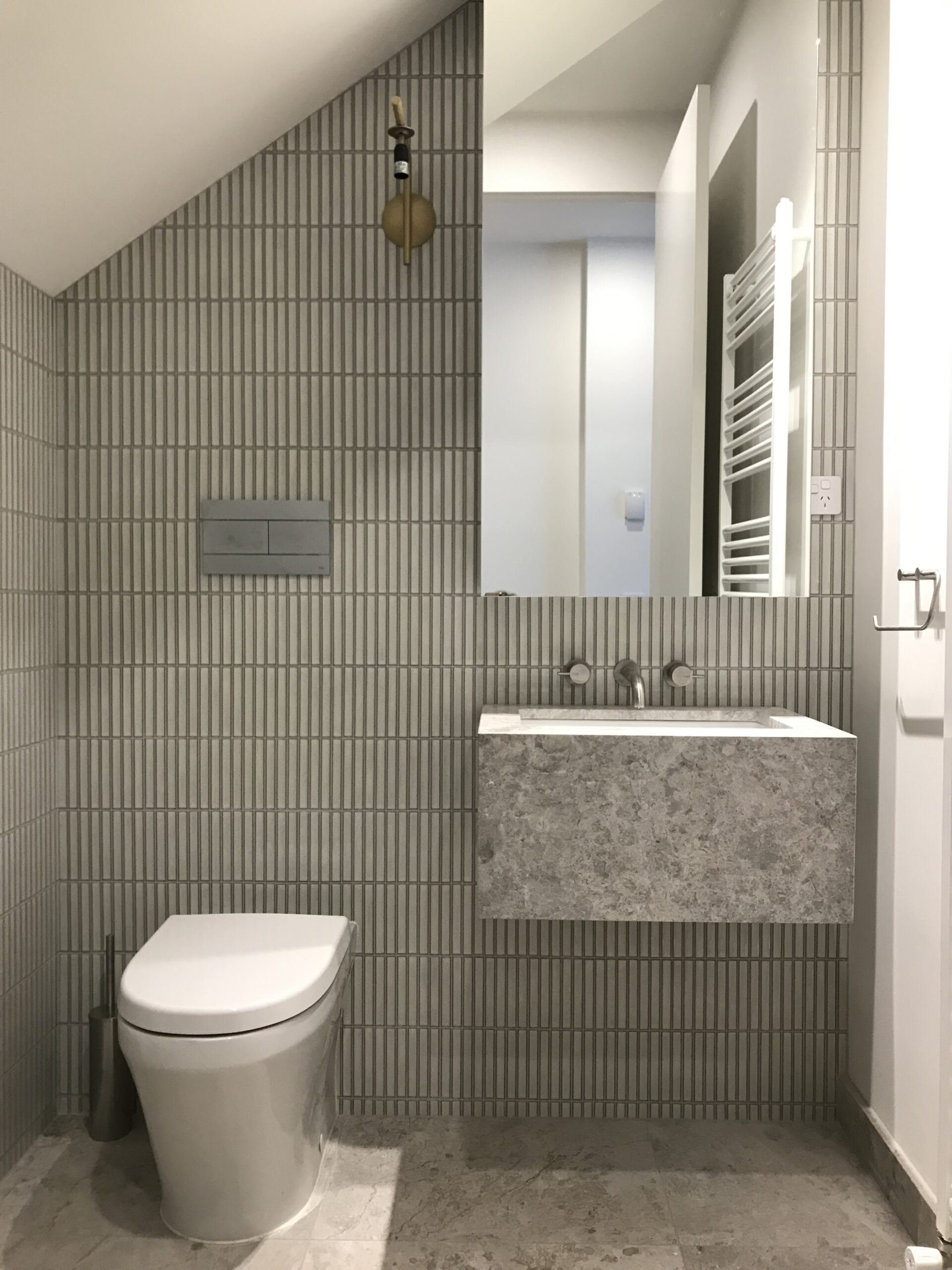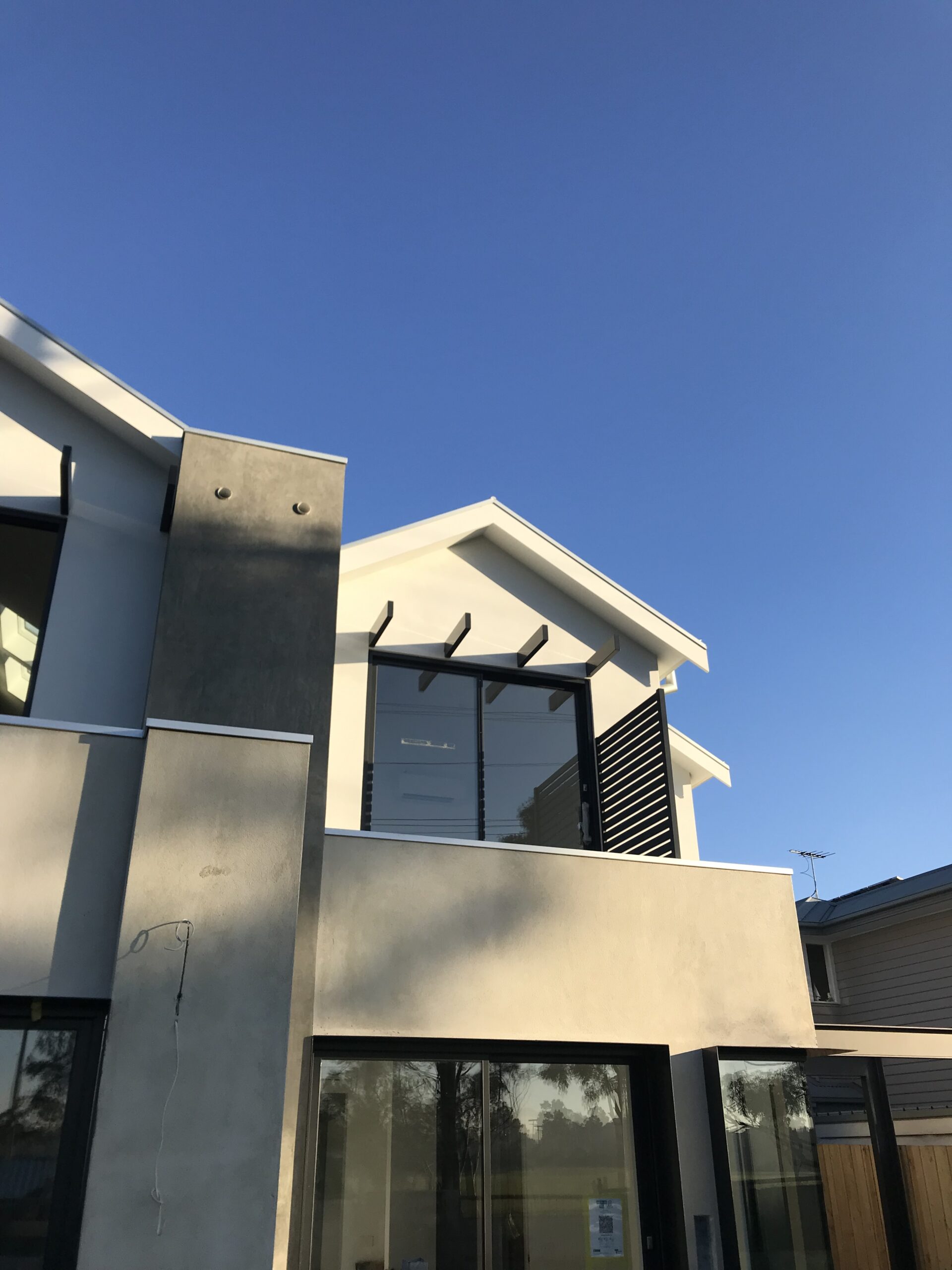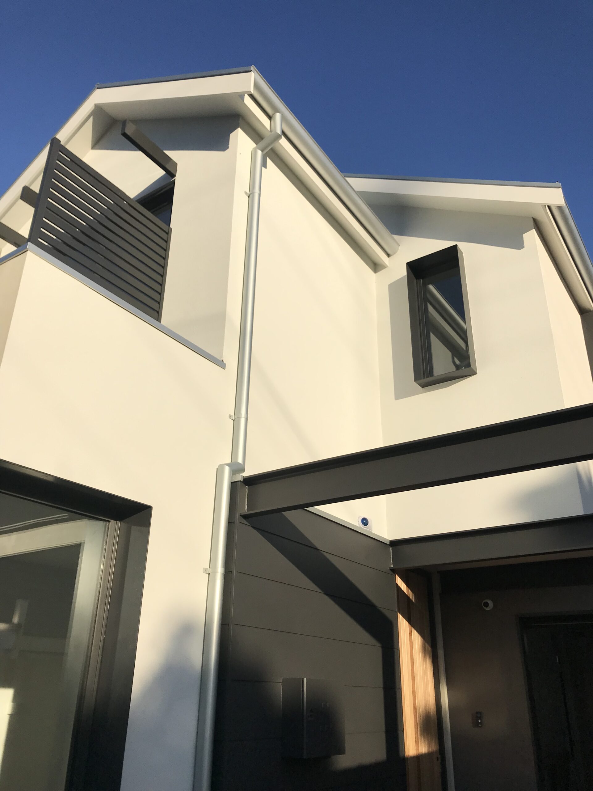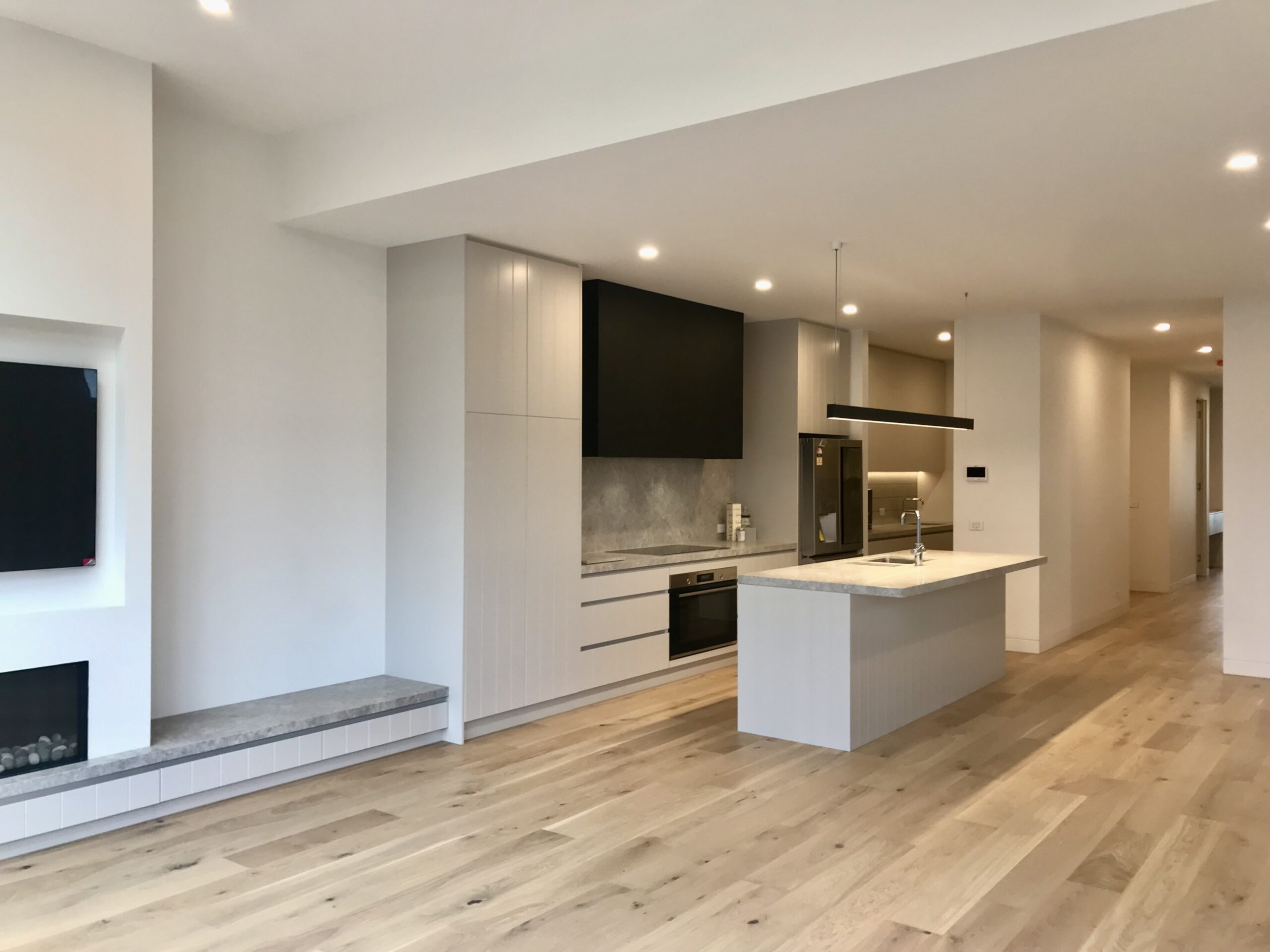 PKD building delivered two distinct homes, each with its own distinct identity. One exudes a monochromatic modern aesthetic, featuring black and white fittings and fixtures, and a polished concrete floor. Conversely, the other exudes a softer feel, incorporating engineered timber floors, grey tundra benchtops and tiles, and numerous timber features.